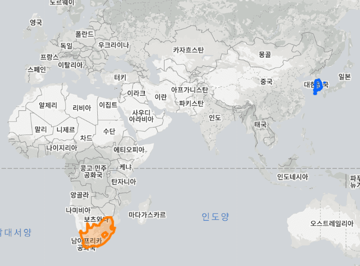 반대로 남아프리카 공화국이 한국 옆에 있을 때에 지도 비교
