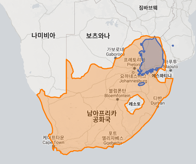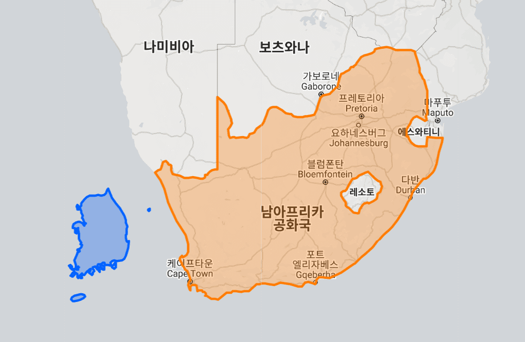 남아프리카 공화국 vs 한국 실제 크기, 면적 비교 지도