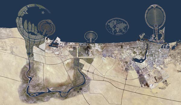 왼쪽에 초승달 모양이 두바이 워터프런트 > 팜 제벨 알리 > 팜 주메이라 > 더 월드 > 팜 데이라