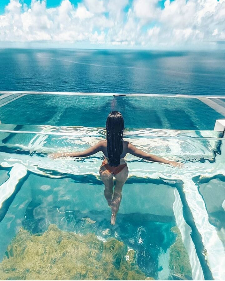 바닥이 보이는 수영장에서 바라보는 바다의 전경, 아래 사진이 가장 유명한 사진이다.