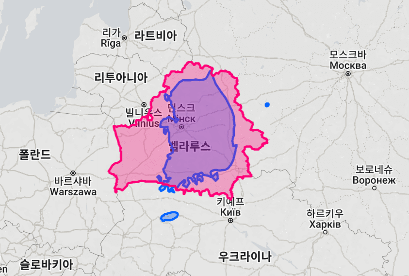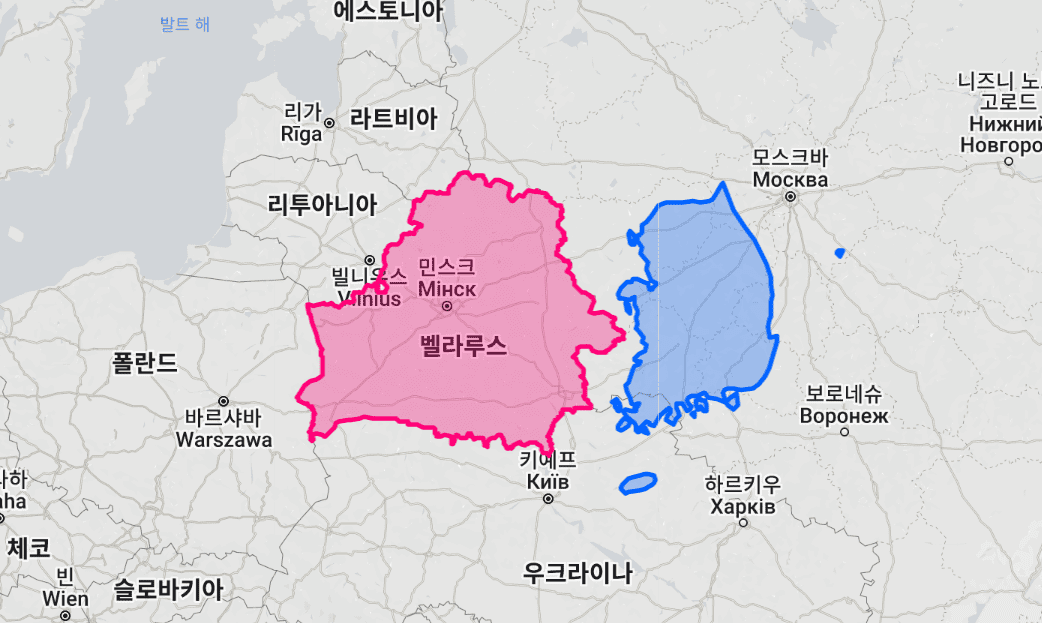 한국과 겹쳐보니 벨라루스가 확실히 큰게 느껴진다.