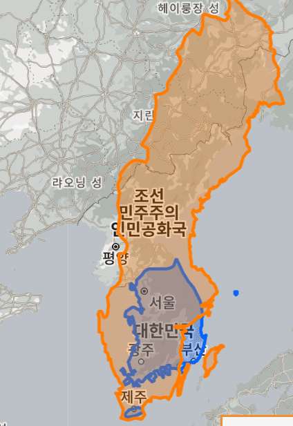 스웨덴이 우리나라에 포개졌을 때의 지도 모습입니다.