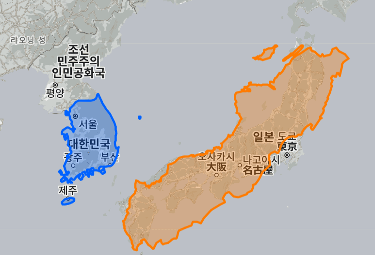 그나마 북쪽에 붙었을때는 우리나라가 좀 커보이네요.