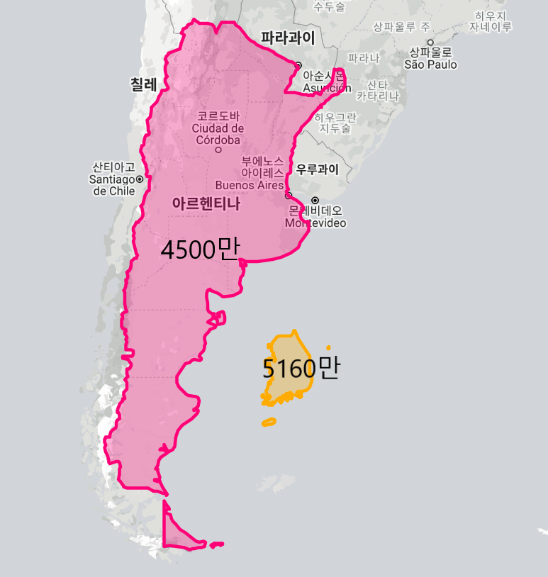 아르헨티나 영토 모양은 좀 길죽하게 생겼고 한국과 비교하면 엄청 큰 나라이다.