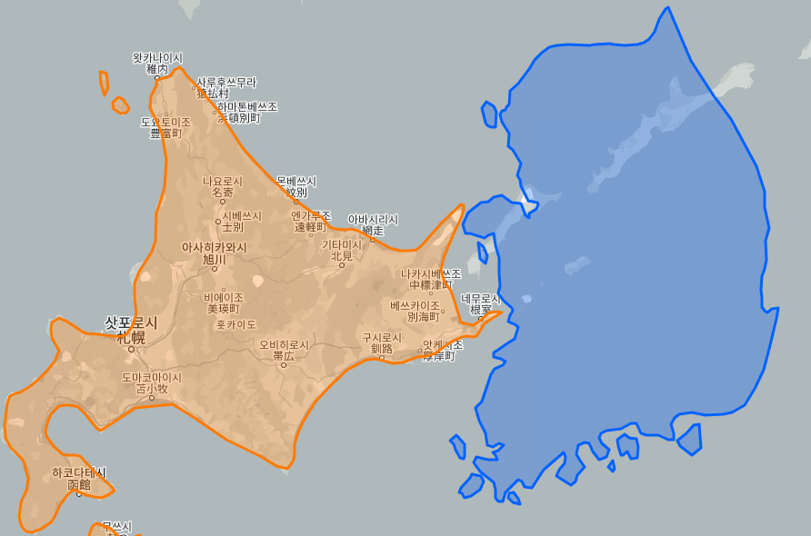 홋카이도 면적: 83,000㎢, 대한민국 면적: 100,401㎢