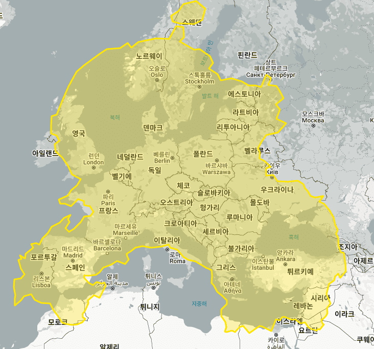 유럽을 통제로 집어 삼켜버린듯한 크기 입니다. 사실 유럽은 워낙 멋지고 아름다운 문화유산이 많이 있고 미디어에서 많이 접해와서 그런지 땅의 크기가 크다는 인식이 있는데 막상 한국, 일본도 그렇고 중국과도 비교해 보면 우리 생각보다는 큰 지역은 아니네요.