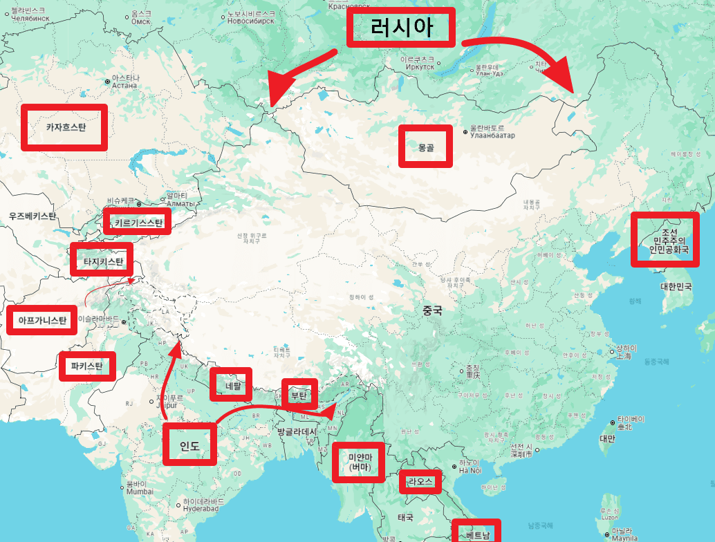 러시아는 카자흐스탄과 몽골 사이로도 연결이 되어 있고 몽골 오른쪽으로도 연결이 되어 있다.