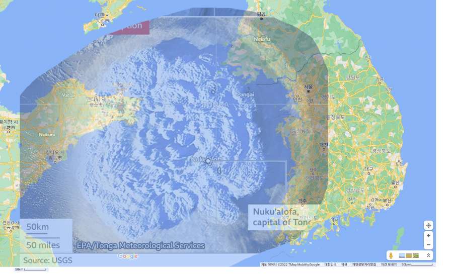 한국 옆에 있을 때 통가 화산 규모 입니다. 백두산이 터지게 되면 어느정도 일지 상상이 가는 부분이네요.