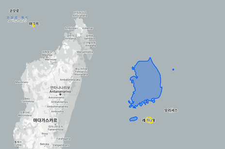 왼쪽에는 마요트 (제주도와 비교하면 작은 크기)