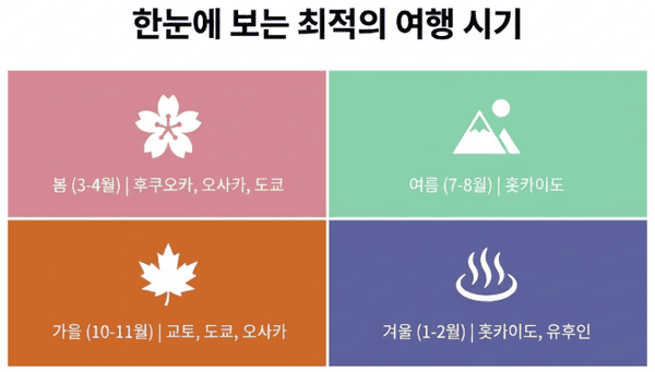 | 겨울 | 1월 ~ 2월 | 홋카이도, 유후인 | 엄청난 적설량, 온천 여행 최적기 |