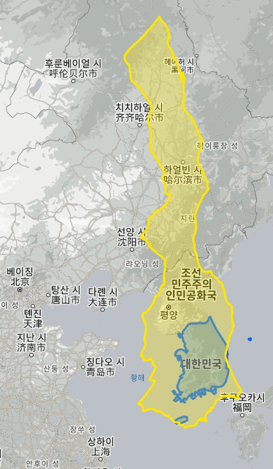 위로 뻗으면 북한과 중국까지 길게 뻗는다.