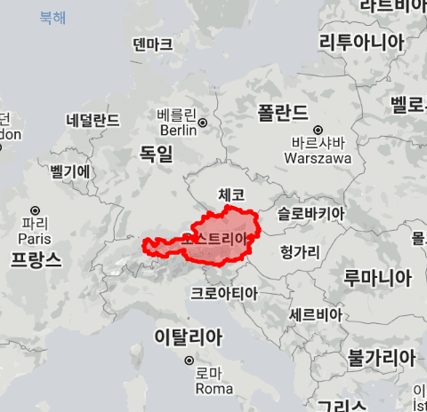반대로 오스트리아이 한국 옆에 있을 때에 크기 비교